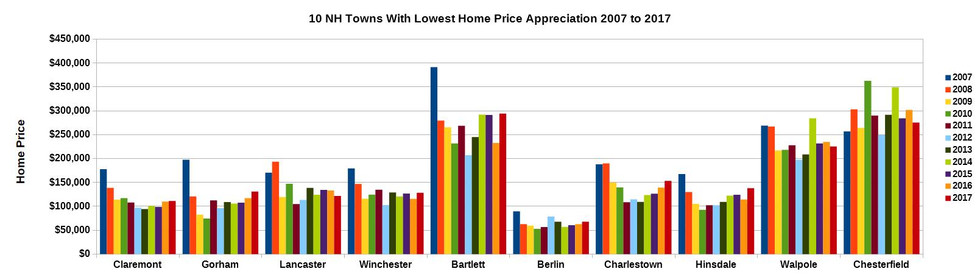 Although every New Hampshire town has had an increase in home values since the market hit bottom in 2012. Not all towns have rebounded equally. The list below outlines the 20 best NH towns for home value appreciaton since the housing crash, and the 20 worst NH towns for appreciation since the housing crash.